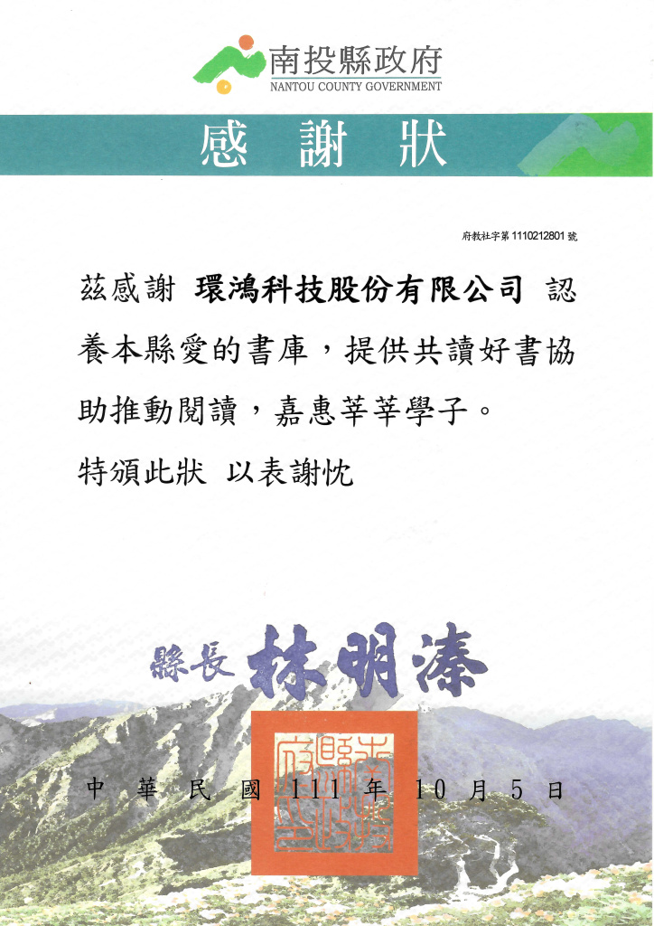 "神马影院午夜达达兔" 2022南投縣政府感謝狀–愛的書庫 (臺灣廠)
