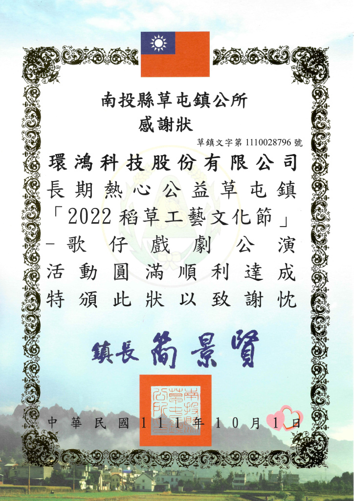 2022南投縣草屯鎮公所感謝狀–稻草工藝文化節 (臺灣廠)